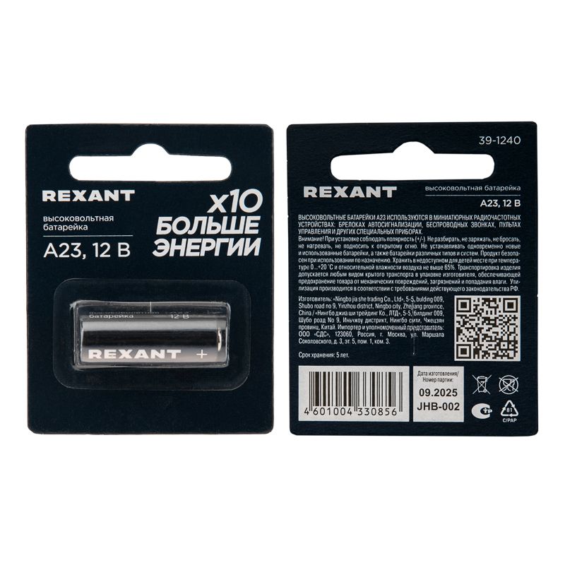 Читать все статьиЭлемент питания 23A (12V) «Rexant» BL-1