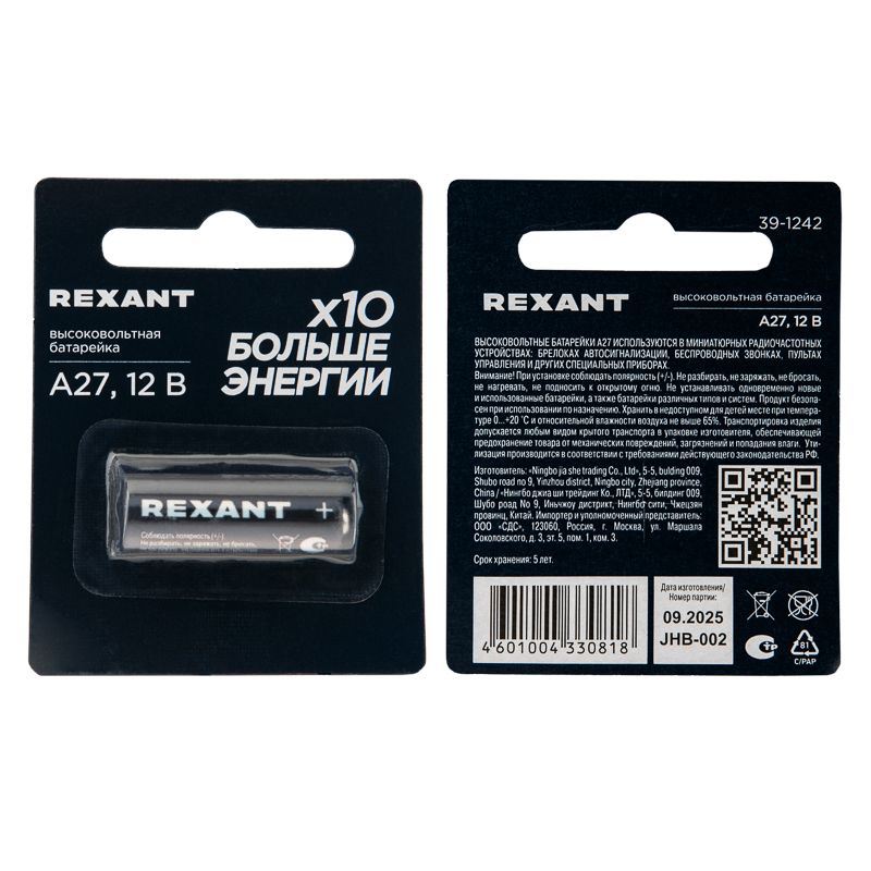 Читать все статьиЭлемент питания 27A (12V) «Rexant» BL-1